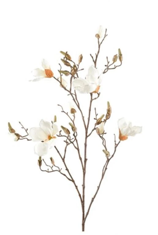Deze Magnolia kunsttak heeft prachtige witte bloemen en knoppen. De kunstbloemen blijven het hele jaar door mooi en hebben geen onderhoud nodig.